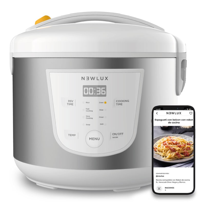 Cuisinez automatiquement toutes sortes de recettes avec ce robot de cuisine multifonction NEWLUX. Facile à utiliser et avec jusquà 8menus préconfigurés, vous navez quà entrer les ingrédients et cest tout!
