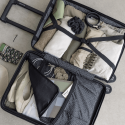 • INTÉRIEUR COMPARTIMENTÉ AVEC RUBANS À PRESSION ET POCHES. La valise cabine dispose d'un compartiment intérieur pratique avec une fermeture éclair et une poche pour les sous-vêtements et des sangles élastiques réglables pour optimiser et économiser de l'espace.