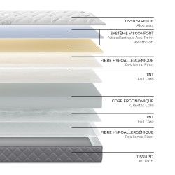 TISSU STRETCH ALOE VERA : Tissu doux et agréable qui agit en offrant un confort et une souplesse inégalés en position allongée dessus. Autrement dit, le matelas prend la forme du corps au lieu de rester rigide. Il garantit également que le matelas viscoélastique jeunesse est toujours bien ventilé et exempt d'acariens, d'humidité et de mauvaises odeurs.