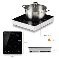 - SURFACE POUR PLAQUES JUSQU'À 19 CM ET AVEC CONTRÔLE TACTILE À LED: Cuisinez où et quand vous voulez! La plaque de cuisson à induction électrique portable se distingue par ses dimensions compactes 31 x 27 x 6,3 cm (L x P x H) et son poids léger (2 kg), en plus de son interface tactile très intuitive. Il a une excellente compatibilité avec les casseroles et poêles de 10 cm à 19 cm de diamètre. Idéal pour les espaces de petites surfaces tels que les appartements, les campings, les caravanes et même les travaux.
