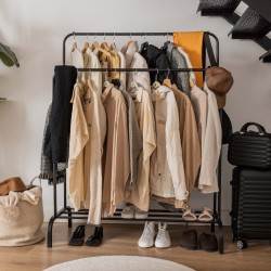 • Barres doubles pour accrocher. Ce vêtement robuste a beaucoup plus d'espace que les autres, car il dispose de deux hauteurs (131 cm et 101,5 cm chaque barre) pour distribuer les vêtements selon leurs différentes longueurs. La distance de 21,5 cm entre les barres laisse suffisamment d'espace pour accrocher deux rangées de vêtements.