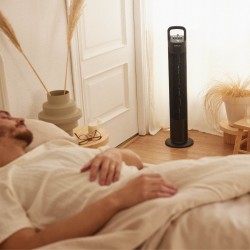 • MINUTEUR 120 MIN. Grâce à sa minuterie intelligente, vous pouvez programmer le ventilateur de tour sans pales de la manière la plus simple et intuitive jusqu'à deux heures et ainsi vous débarrasser tout en économisant sur votre facture d'électricité.