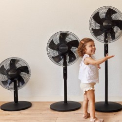 • 3 VITESSES ET ROTATION À 90°. Profitez d'une sensation d'air frais à tout moment, en choisissant le débit d'air dont vous avez besoin (haut turbo, moyen-éco et basse-sleep) et en utilisant votre système d'oscillation pour obtenir un meilleur angle d'aération du ventilateur sur pied avec télécommande.